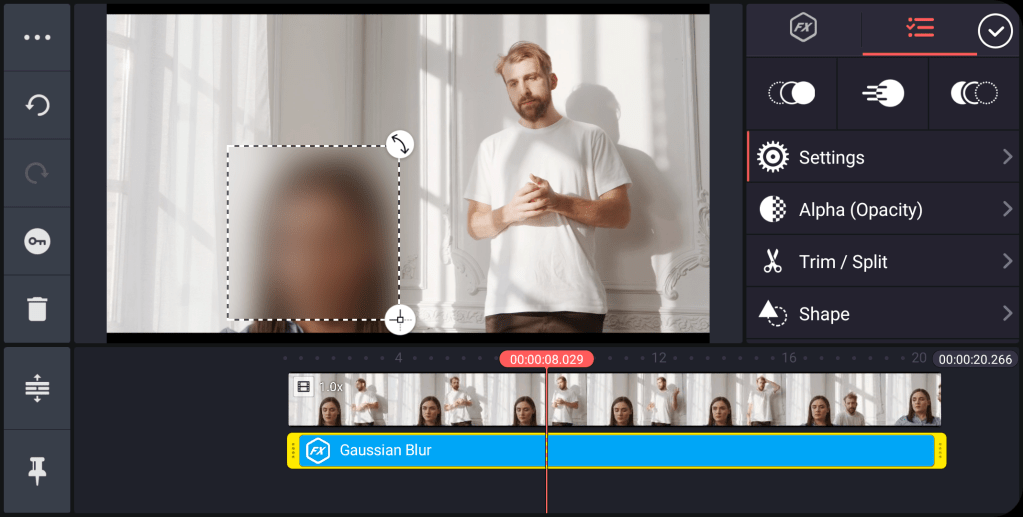 Up until recently the best app for anonymizing persons and/or certain parts of a video in general was KineMaster which I already praised in my last blog about the best video editing apps on Android (it’s also available for iPhone/iPad). While it’s possible to use just any video editor that allows for a resizable image layer (let’s say just a plain black square or rectangle) on top of the main track to cover a face, KineMaster is the only one with a dedicated blur/mosaic tool for this use case. Many other video editing apps have a blur effect in their repertoire, but the problem is that this effect always affects the whole image and can’t be applied to only a part of the frame. KineMaster on the other hand allows its Gaussian Blur effect to be adjusted in size and position within the frame. To access this feature, scroll to the part of the timeline where you want to apply the effect but don’t select any of the clips! Now tap on the “Layer” button, choose “Effect”, then “Basic Effects”, then either “Gaussian Blur” or “Mosaic”. An effect layer gets added to the timeline which you can resize and position within the preview window. Even better: KineMaster also lets you keyframe this layer which is incredibly important if the subject/object you want to anonymize is moving around the frame or if the camera is moving (thereby constantly altering the subject’s/object’s position within the frame). Keyframing means you can set “waypoints” for the effect’s area to automatically change its position/size over time. You can access the keyframing feature by tapping on the key icon in the left sidebar. Keyframes have to be set manually so it’s a bit of work, particularly if your subject/object is moving a lot. If you just have a static shot with the person not moving around a lot, you don’t have to bother with keyframing though. And as if the adjustable blur/mosaic effect and support for keyframing wasn’t good enough, KineMaster also gives you a tool to add an extra layer of privacy: you can alter voices. To access this feature, select a clip in the timeline and then scroll down the menu on the right to find “Voice Changer”, there’s a whole bunch of different effects. To be honest, most of them are rather cartoonish – I’m not sure you want your interviewee to sound like a chipmunk. But there are also a couple of voice changer effects that I think can be used in a professional context.